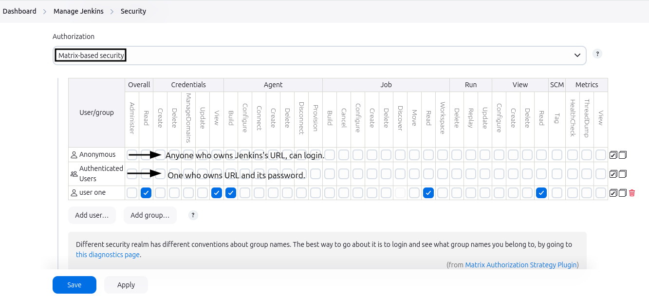 - Jenkins has a built-in security system that allows you to configure access control for users and groups.