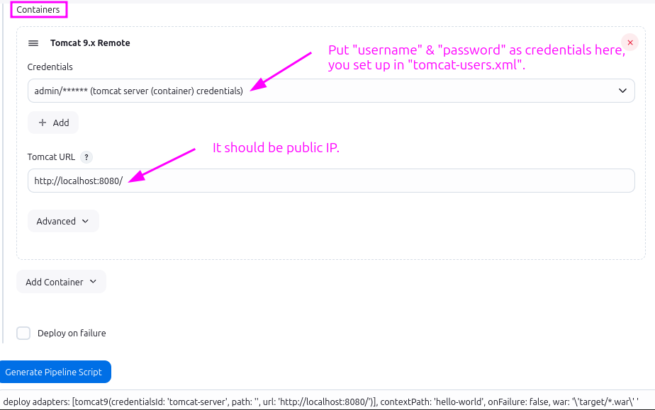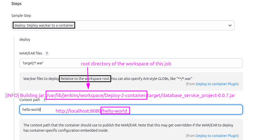 deploy adapters: [tomcat9(credentialsId: 'tomcat-server', path: '', url: 'http://localhost:8080/')], contextPath: 'hello-world', onFailure: false, war: 'target/*.war'