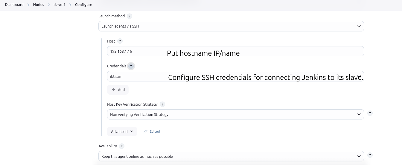 Add the SSH credentials in Jenkins to establish a connection to the slave: - Username: